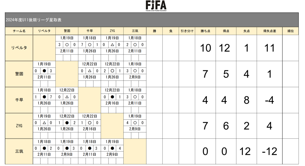 U11A 福岡地区リーグ 2部Aパート 第3・4節 投稿日 2025年1月23日 著者 manager カテゴリー U-11 U11A 福岡地区リーグ 2部Aパート 第3・4節 第3節 三筑 3-0 〇(3-0.0-0) 第4節 リベルタ 0-3 ●(0-3.0-0) リーグ戦も折り返し。 課題はもちろんありますが、収穫もあり,緊張感のあるゲームで成長中です! 目標の1部復帰に向けて、残り4試合。 やればできる!
