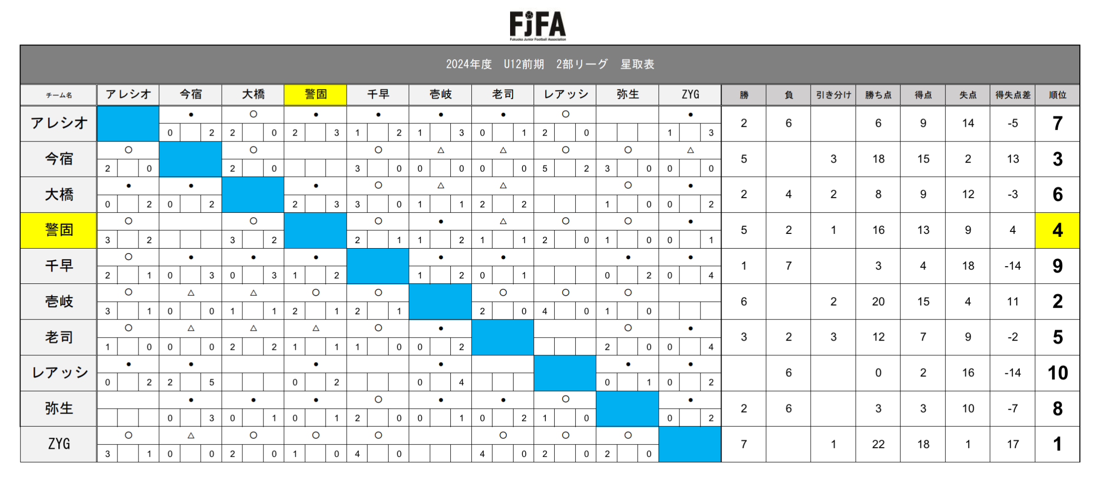 5勝2敗1分 勝ち点16 得点13 失点9 10チーム中4位