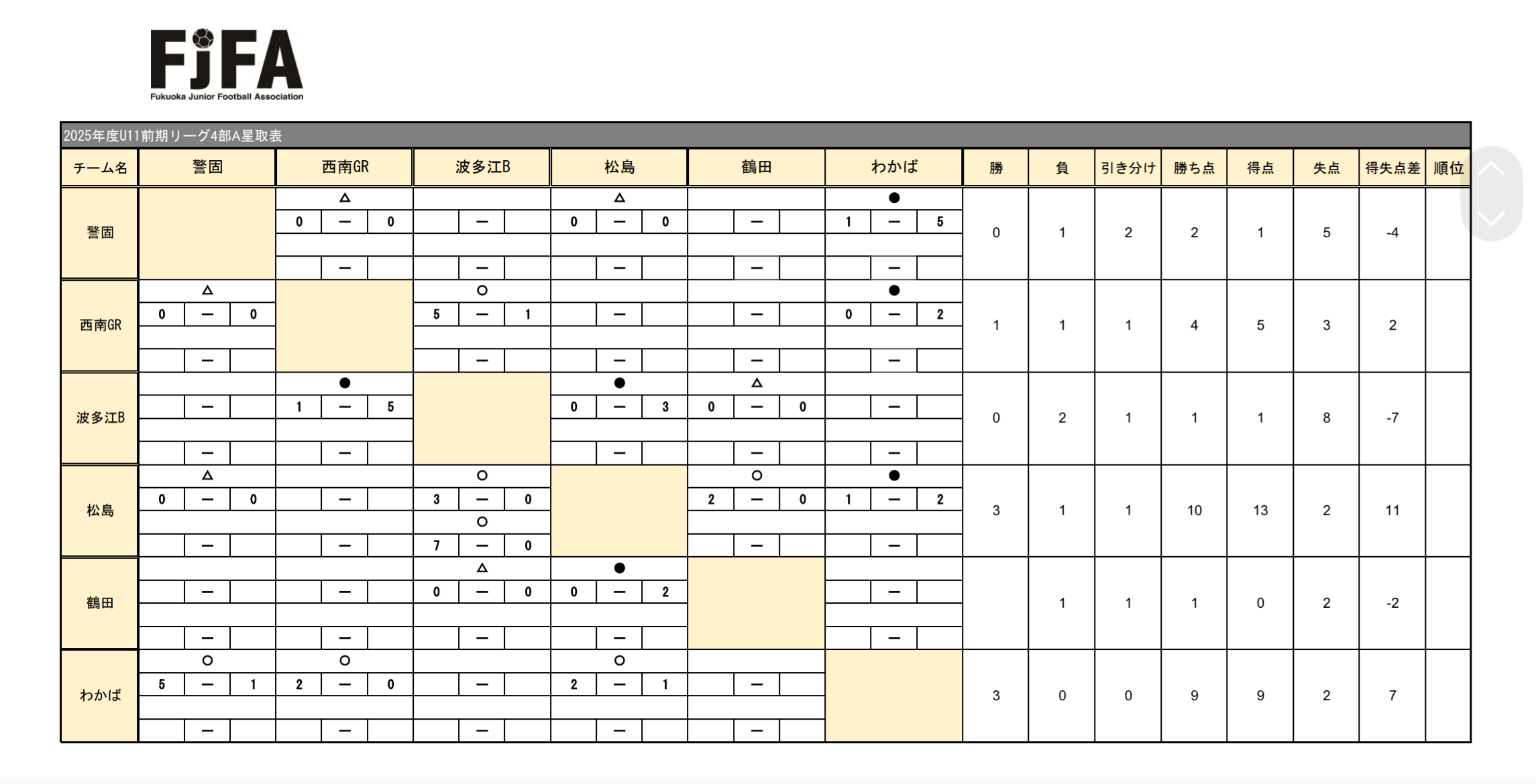 U11 福岡地区リーグ 前期 第3節 投稿日 2025年7月2日 著者 manager カテゴリー U-11 U11 福岡地区リーグ 前期 第3節 西南GR 0-0 △ 上位争いに食い込む為にも、ここらで勝ち点が欲しい試合でしたが、勝利ならず。ピンチもありましたが、ものに出来る決定機もあっただけに悔しい試合となりました! 7・8月のリーグ戦中断期間を経て、9月より前期リーグ,新人戦となります。 夏の活動でU11・U10ともにレベルアップして次節に臨みましょう! 応援ありがとうございました!