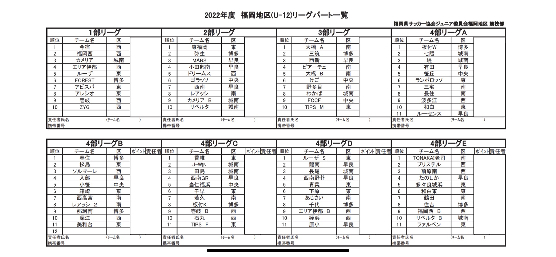 2022年度 福岡地区 U12 リーグパート 投稿日 2022年3月30日 著者 manager カテゴリー U-12 2022年度 福岡地区 U12 リーグパート 2020年度チャンピオンシップ中止, 2021年度の新人戦の結果が今回のパート分けに反映されてます。 ■3部リーグ 要項 ・今年度より前期・後期の2部制 ・1回戦総当たり戦 ・前期自動昇格3チーム、自動降格なし ・前期の結果を全日のシード枠に反映 4月第3週より開幕予定です。 ラスト1年、悔いのないようにやりきろう!
