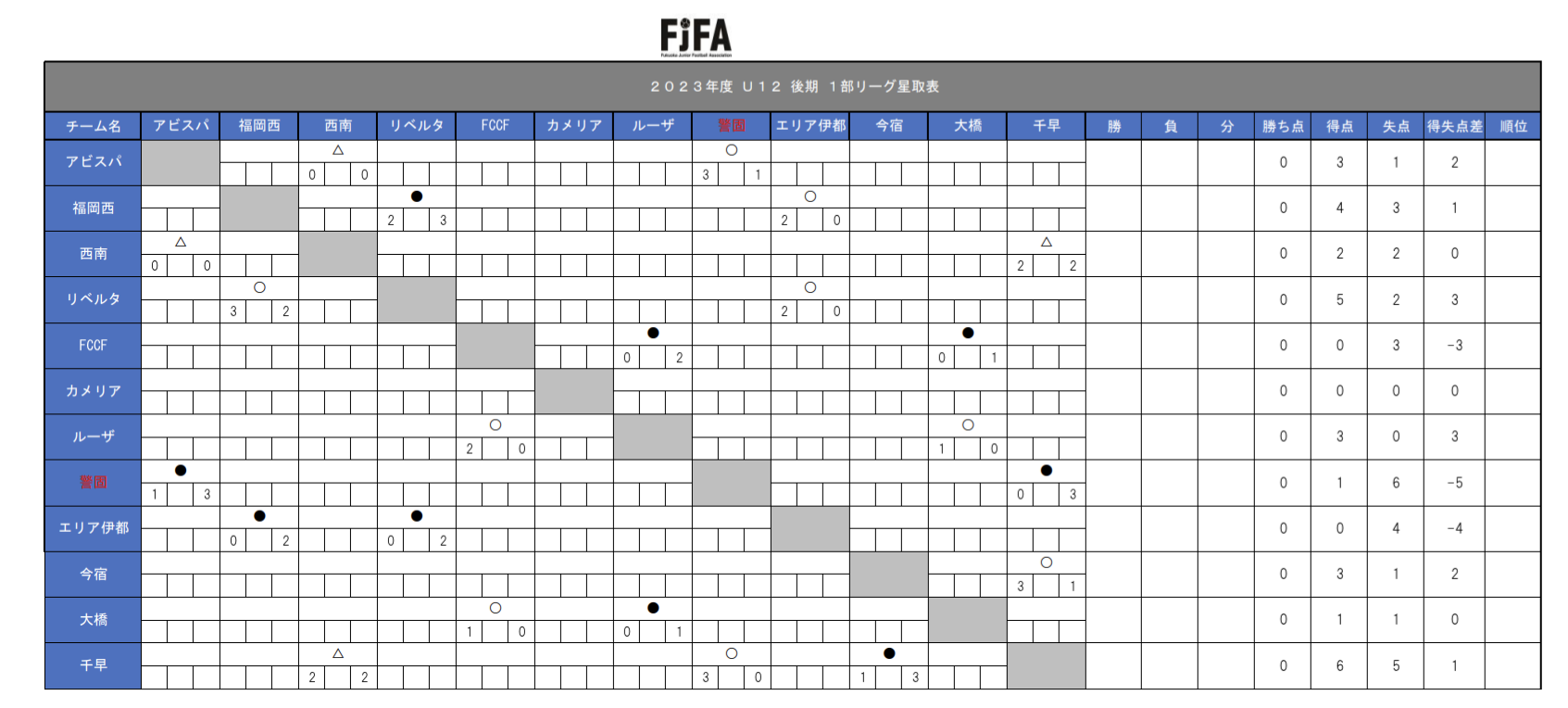福岡地区リーグ U12 1部リーグ 後期開幕! 投稿日 2023年9月8日 著者 manager カテゴリー U-12 福岡地区リーグ U12 1部リーグ 後期 第1節 千早 0-3 ●(0-1.0-2) 14’25’27 失点 第2節 アビスパ福岡 1-3 ●(0-0.1-3) 23’得点、32’38’39 失点 怪我から回復しつつある選手も増え、チームとしてベストな状態に戻りつつあるが、安心感が隙となってしまったのか。少しシビアな部分が、足らない試合となってしまいました。 一人ひとりのタスクは減ったはず、強度を落とさず各々のパフォーマンスをチームに還元できるといいですね。 全日まで残り1ヶ月!